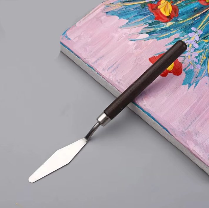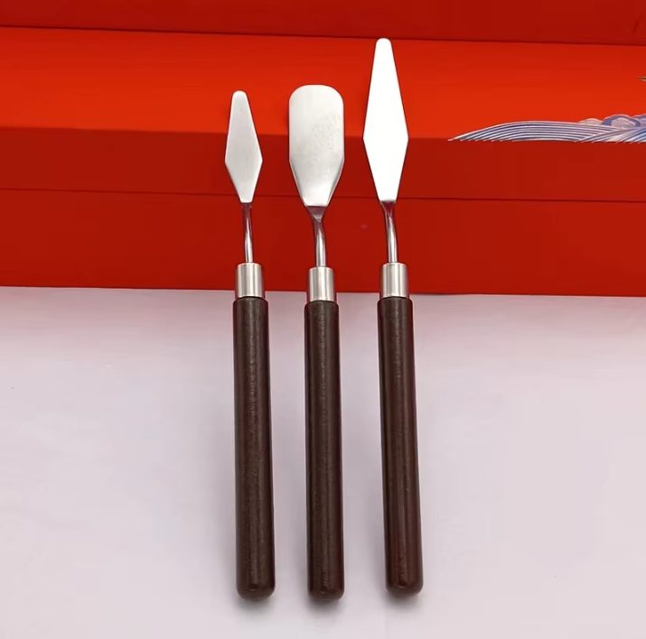 - Škrabka (palette knife) – pre miešanie farieb na palete a nanášanie textúrovaných vrstiev.