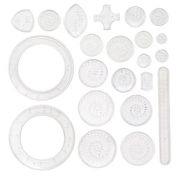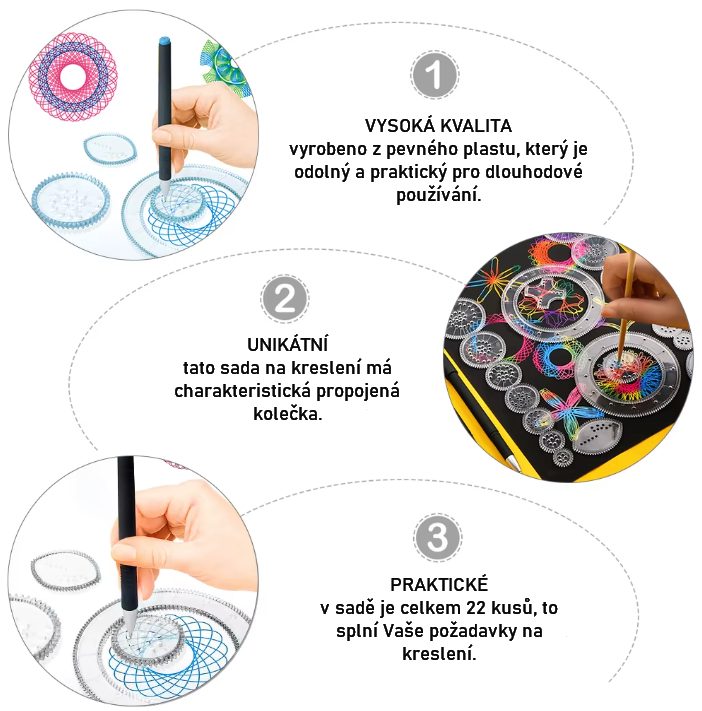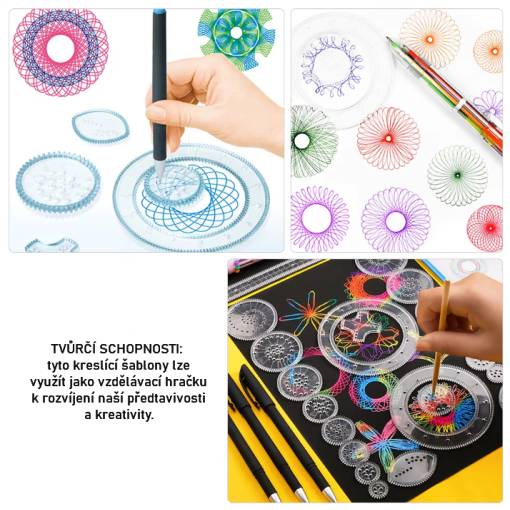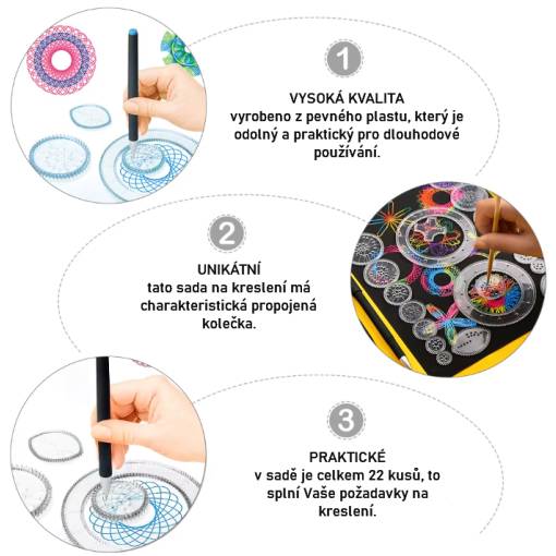 Prepojené ozubené kolesá umožňujú vytváranie tisícov jedinečných vzorov a tvarov, takže tým môžete rozvíjať svoju predstavivosť a jemnú motoriku pri každom použití.