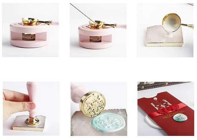 Roztavený vosk môžete nalievať na papier, obálku či iný povrch a vytvoriť tak krásnu pečať pomocou priloženého razítka. Perfektné pre scrapbooking, dekoratívne remeslá, tvorbu darčekov alebo originálnych oznámení.