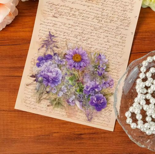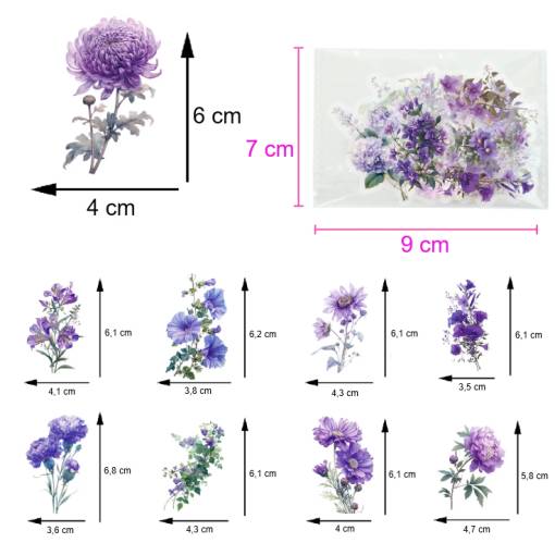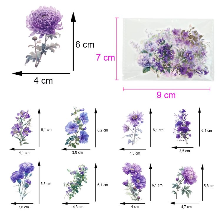 Dajte svojim kreatívnym projektom jemnosť a romantickú atmosféru s touto sadou 50 prTransparentných kvetinových samolepkách v odtieňoch fialovej.
